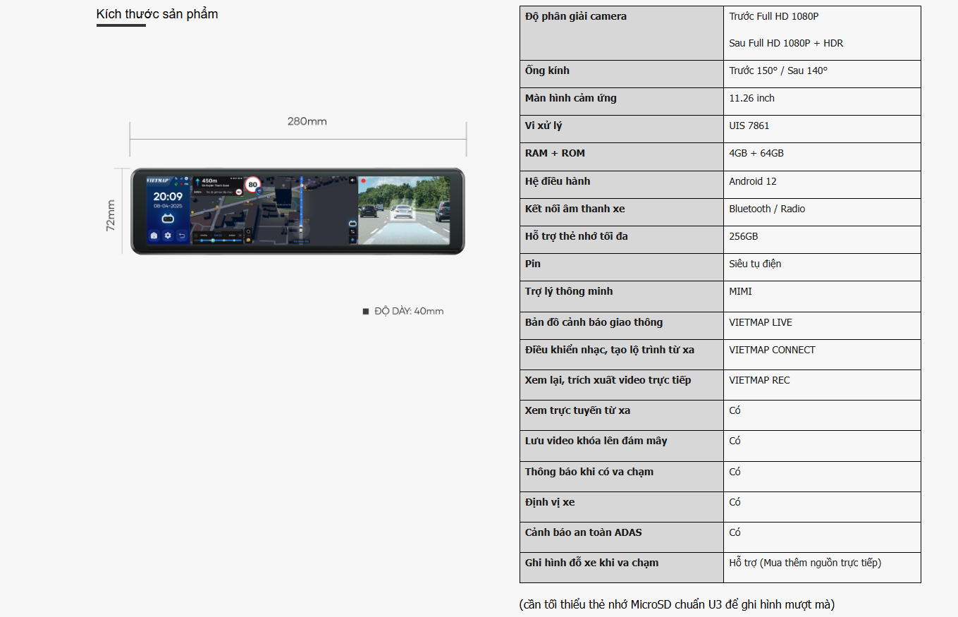 Thông số kỹ thuật của camera hành trình gương Vietmap V740