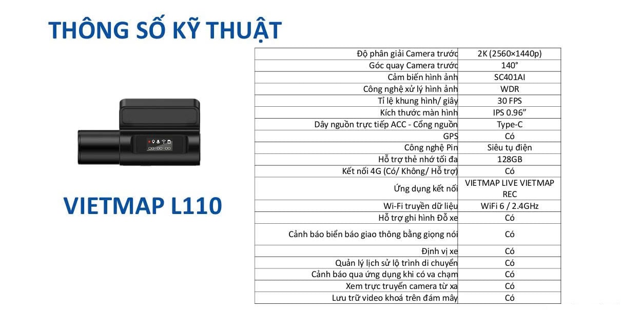 Thông số kỹ thuật chi tiết của camera hành trình Vietmap L110 chính hãng